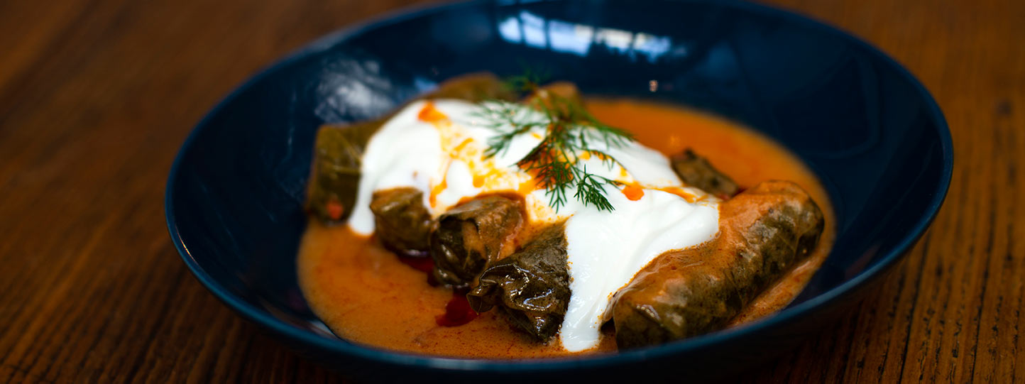 spicy mince and rice stuffed vine leaves served with creamy yoghurt